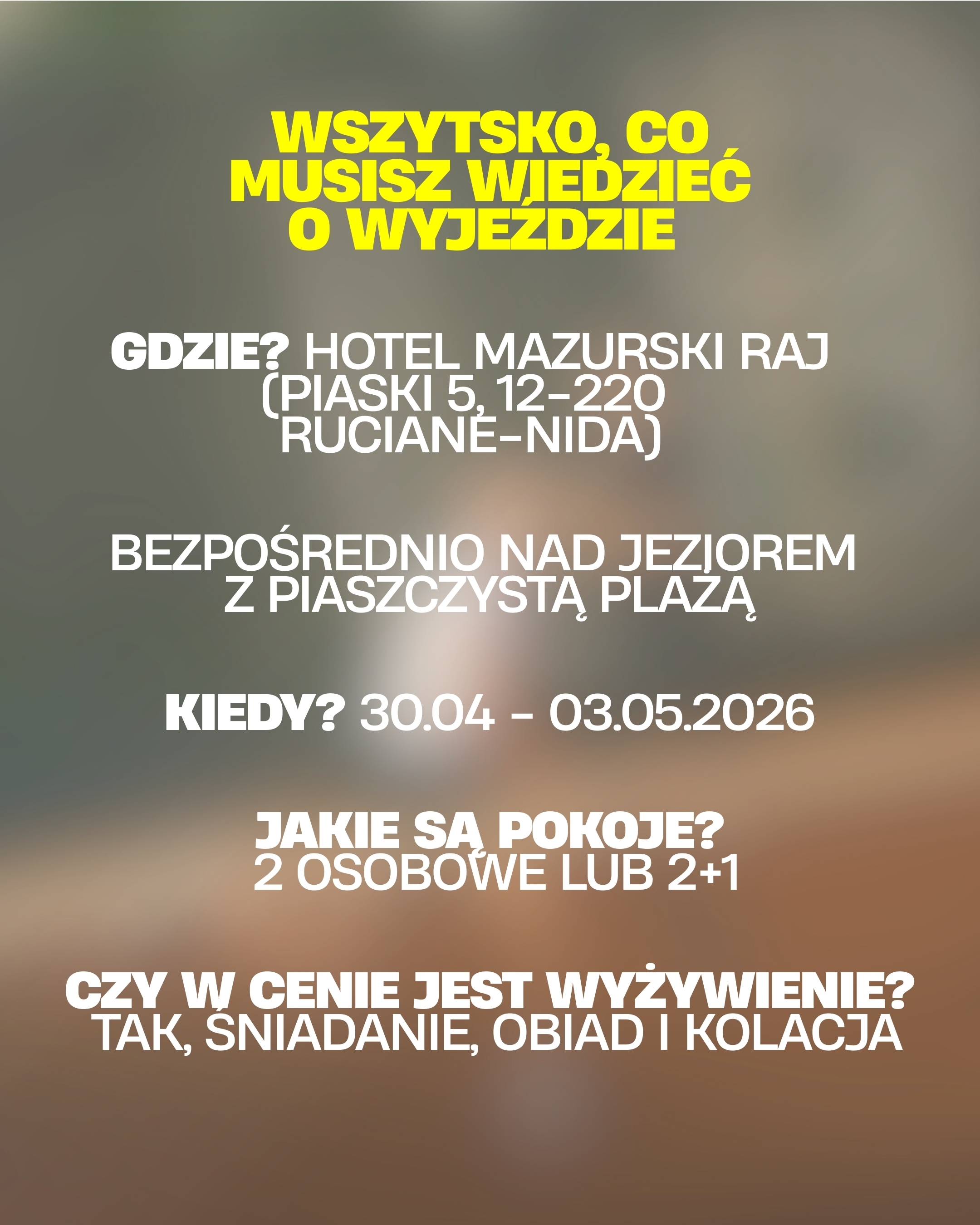 Cztery dni treningów, regeneracji i czasu z bliskimi spędzimy w jednym z najpiękniej położonych hoteli w regionie - nad samym jeziorem, w otoczeniu mazurskiej przyrody.